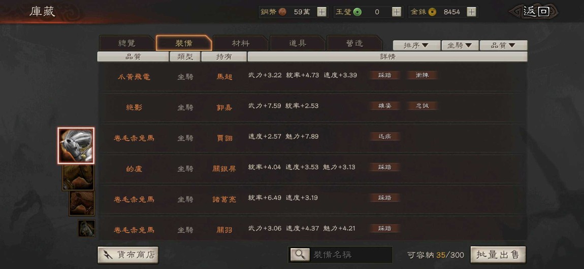 典藏上頭只剩5隊 賽季一個月結束5隊夠用了 裝備主打5踩踏馬.1衝陣馬.1扶危馬.1赳螑馬其他以圖片為主 金株流動不確定數量 請善用問與答