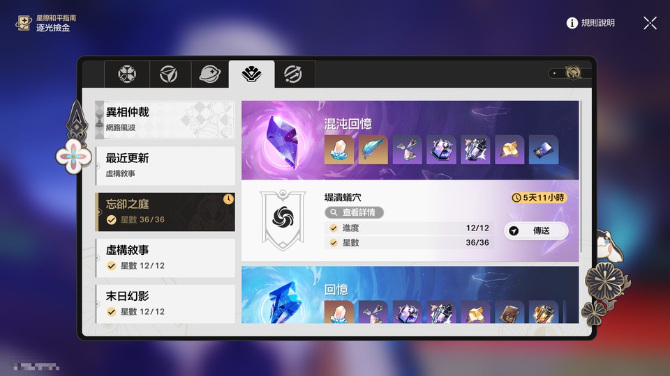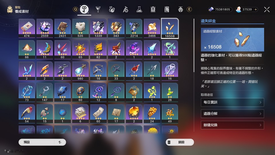 遺器畢業: 存有 82 個「自塑塵脂」、12,584 個遺器殘骸。遺器主屬性自己訂製。