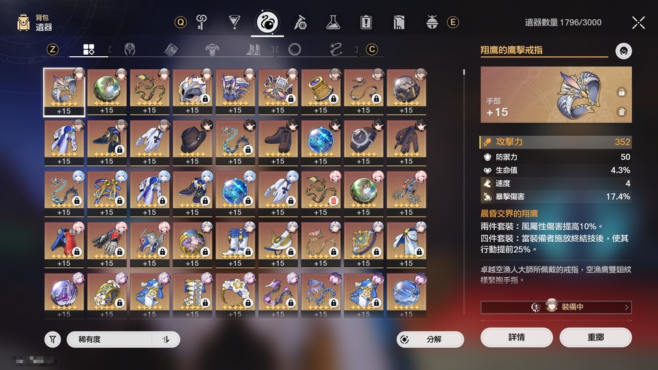 海量遺器: 背包遺器庫存極多,且詞條優質(雙暴/速度等),多套畢業裝可隨時平替給新角色。