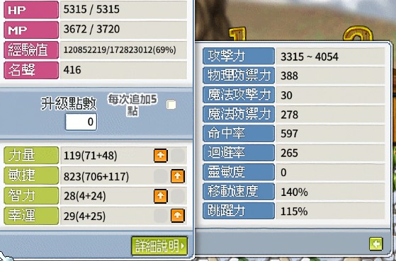 技能:會心一級.暴風神射.弓術精通.30.楓葉祝福9坐騎:銀色鬃毛