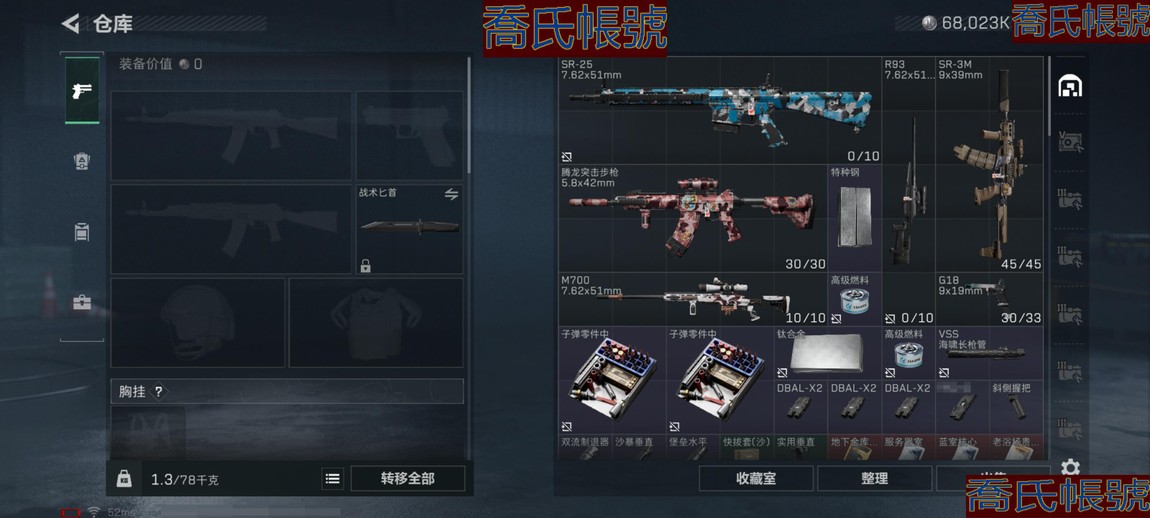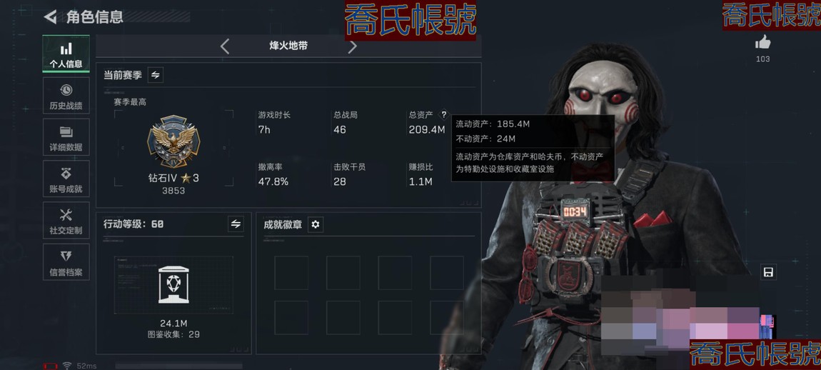 【OBSQRQE878842】總資產:209M,哈夫幣:6802W,武器皮膚:1,烽火60級:【安全箱】基礎安全箱;【特勤處等級】倉庫LV.7,靶場LV.4,訓練中心LV.5;【幹員皮膚】紅狼電鋸驚魂;【步槍皮膚】KC17突擊步槍-電鋸驚魂;(資訊源於賣家釋出,實際資訊以驗號為準)【QQ登入】總資產209.4m/現金68023k/電鋸驚魂紅狼/可二次
