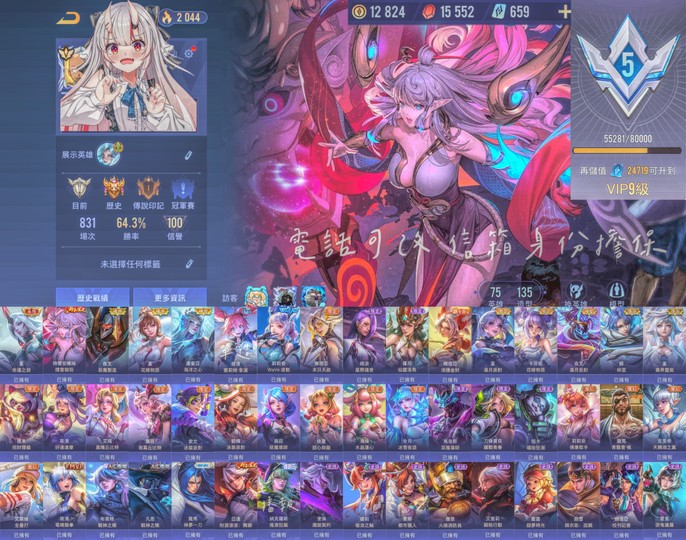 【Garena帳有綁定、戰場傳說、V8、75英、135造】女用 高勝 煙雲 命運 夜叉惡魔 菫花嫁 蜜莉姆 狐狸女團 滿月 滿月 異界