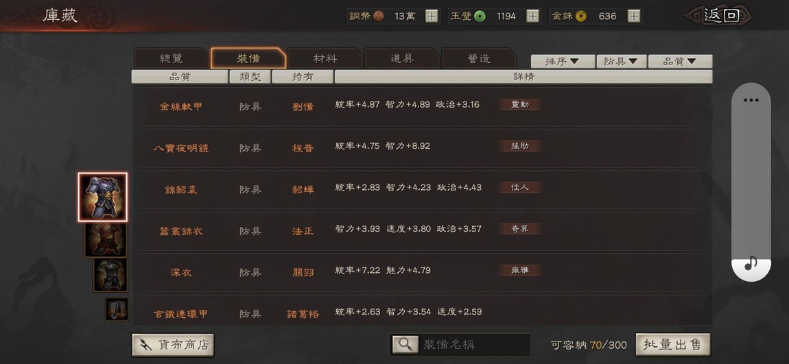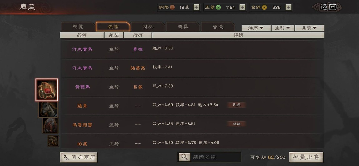 特技裝備 奇算 雍雅 奸雄 號令 雄烈 機巧 馬: 赳螑 護主 出奇 嘶風 扶危 2援助 4踩踏 3靈動 3好學 等等等如截圖