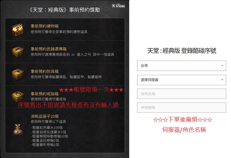 事前登入序號: 長劍or獵弓、骷髏整套、守護戒指、藥水20袋【需要開專屬】
