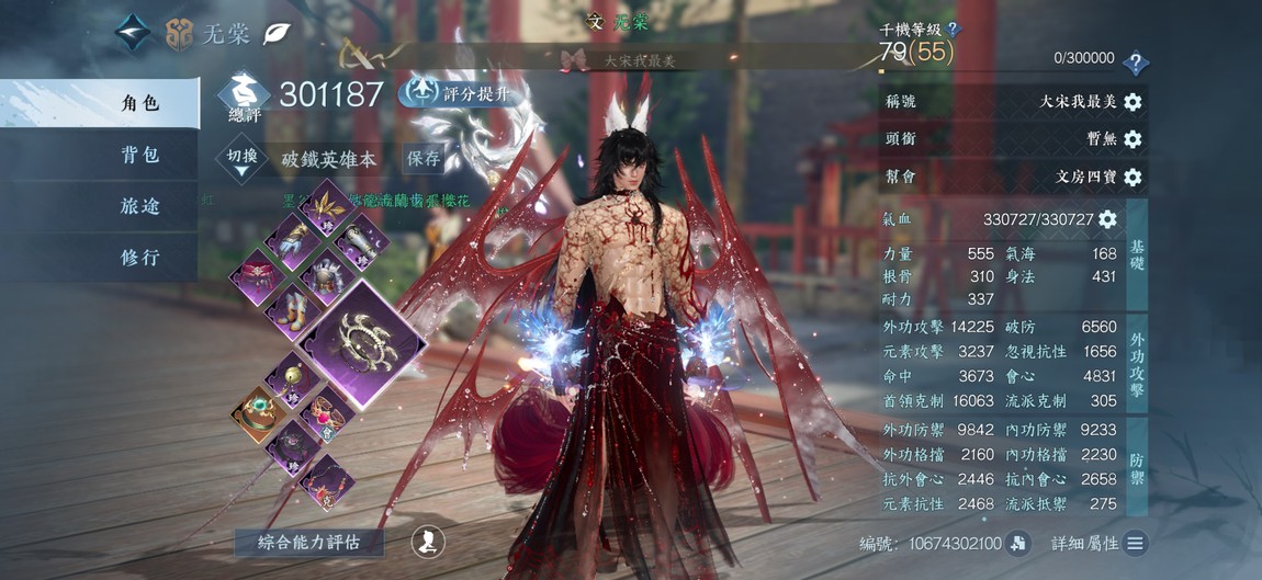 鐵衣進度號等級79(55)(裝備目前畢業)已使用10顆天賞石 6顆綁定未用天賞石 有六尾狐 3個天賞外觀 173張尋俠帖
