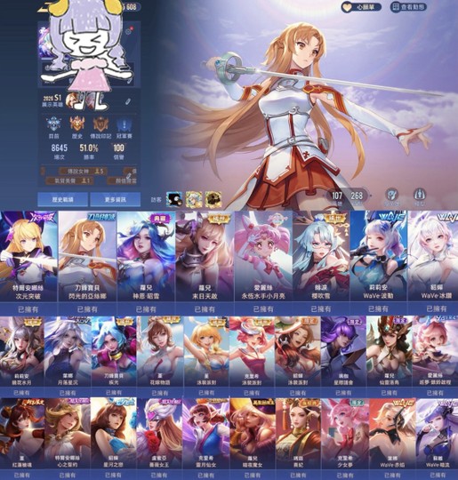 【Garena帳有綁定、星耀、V9、107英、268造】歷史璀璨,特爾次元、蘿兒昭雪末日、亞絲娜等多限定造形女用帳!