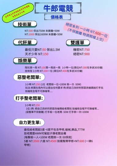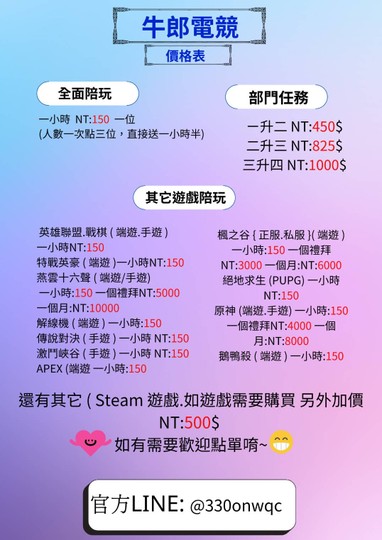 全面陪玩: 一小時 NT300 一位 (如需求陪玩人數一次點兩位的話直接送一小時)