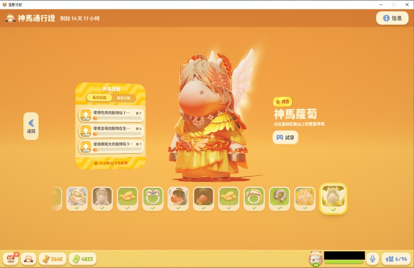 Steam的猛獸派對 150等 猛獸錢錢4833元 餅乾264K 有不少皮膚 馬年通行證 滿級