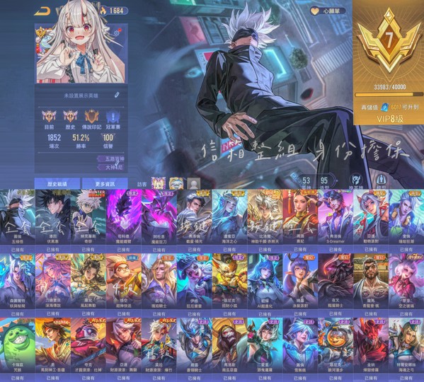 【Garena帳有綁定、星耀、V7、53英、95造】五條悟 奇犽 伏黑惠 思科德魔能 阿杜恩魔能 比洛爾新年 熹妃 截星 貓妖 深海