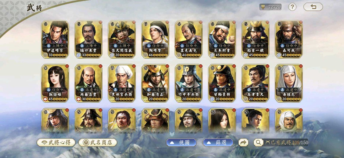 S20002 霸業盟 多核心 多戰法 48金將+7隱退金將+18個金將心得+20個S級戰法,(等於有85個金將)還有尚有超過12000小判,大小月卡。