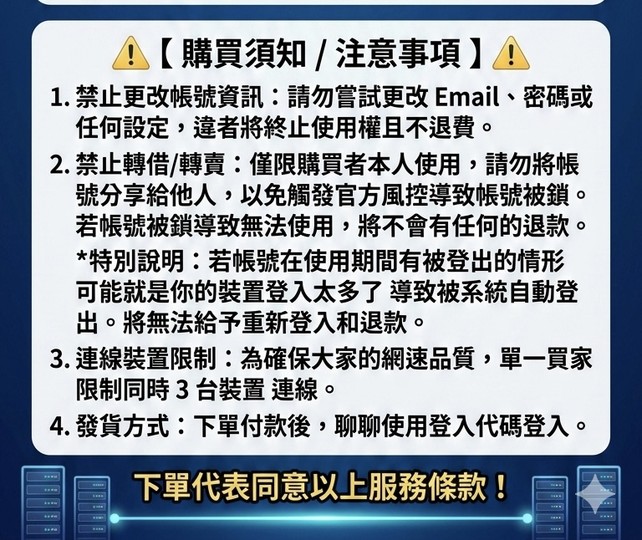 1. 禁止更改帳號資訊: 請勿嘗試更改 Email、密碼或任何設定,違者將終止使用權且不退費。