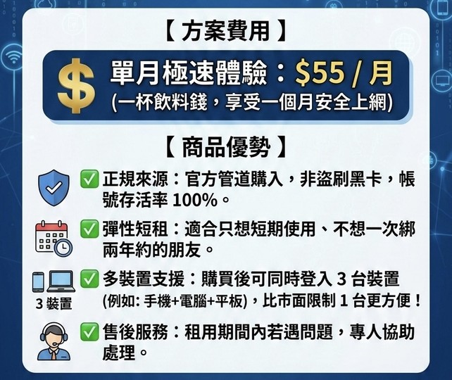 💰 單月極速體驗:﹩55 / 月 (一杯飲料錢,享受一個月安全上網)