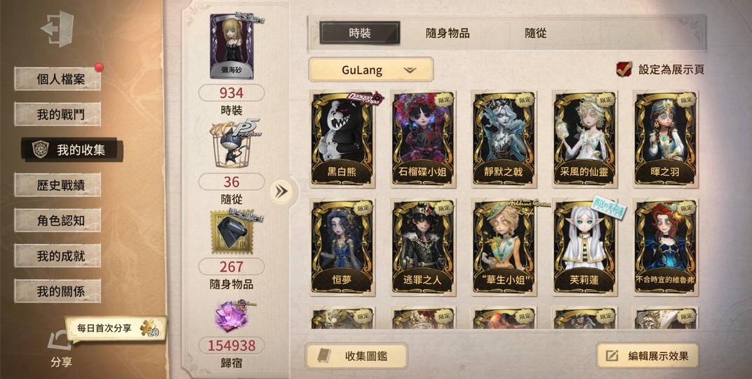 本帳號為資深收藏家心血,金皮純度極高,【右上角有標籤】的絕版限定占比超過一半。時裝總數逼近 1000 件,資源海量,保值性與吸睛度皆為全網頂規。