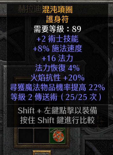 術士傳送項鍊/+2技能/8施法/20火抗/22mf/等級2傳送,可改剛毅傷害提高