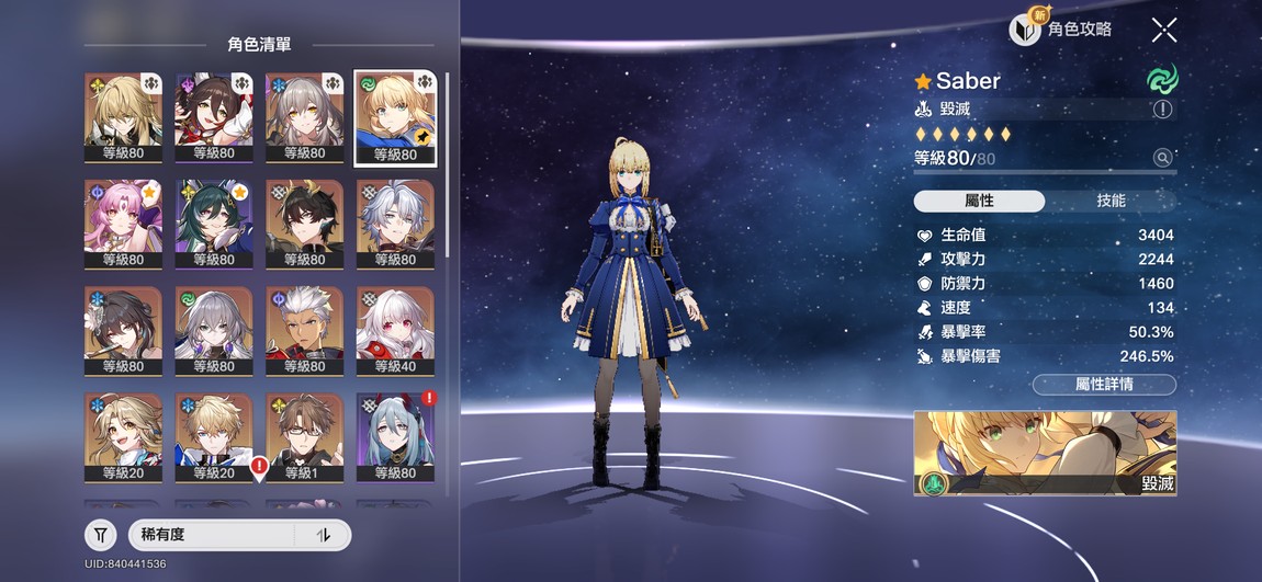 【女、70等、12金角、4金專】阿爾托莉雅saber 6+1滿命號 練度還不錯 大保底 手刷號 初始信箱整組給