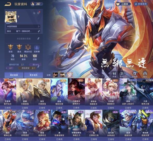 【Garena帳無綁無連、黃金、無VIP、44英、31造】✨薩尼戰神、克里希仙女、葉娜聖典、瑞克聖典、奎倫嘻哈✨
