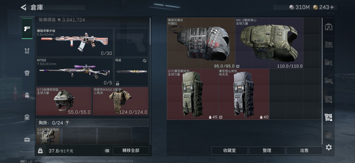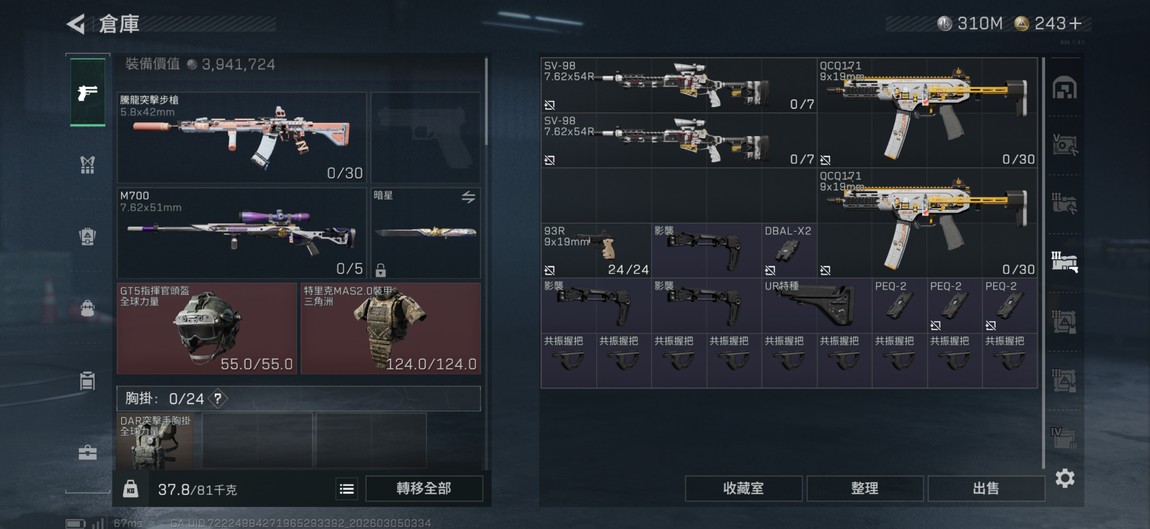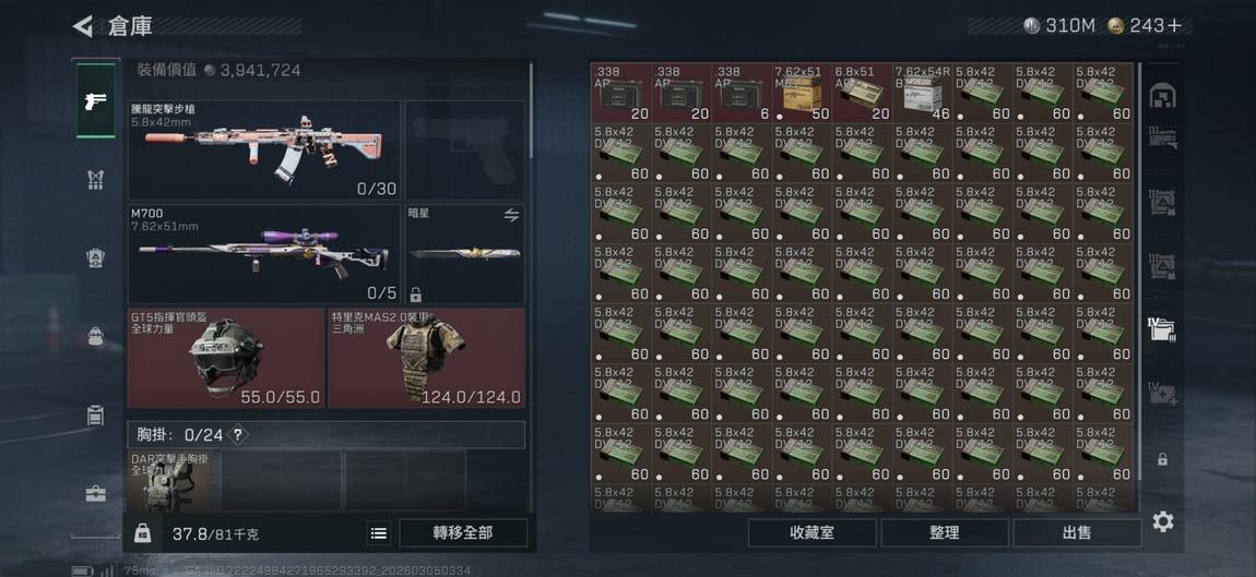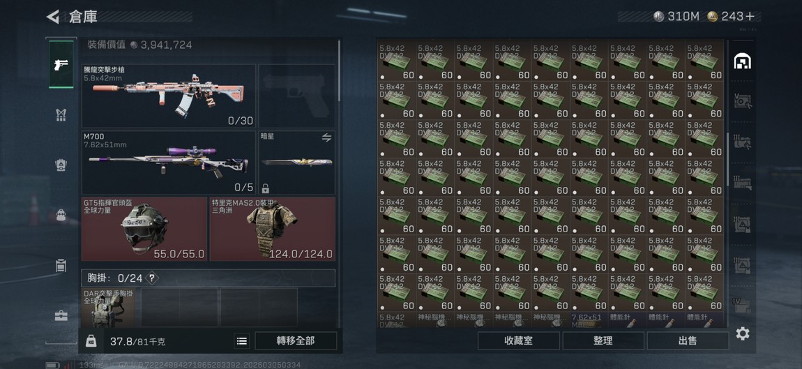 金槍皮很多、2個通行證箱子幾乎沒開、騰龍五彈7000多發、紅皮4個槍皮兩個310m現金紅收集50多種