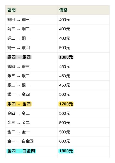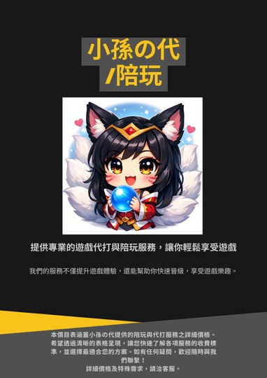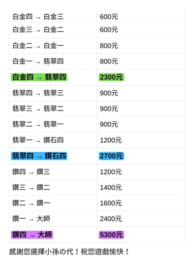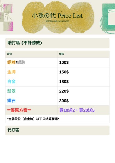 ╔═════════════════════╗ ║🎮 小孫の代 / 陪玩服務價目表 🎮 ╚═════════════════════╝ --- 🕹️ 陪打區(不計勝敗) | 段位 | 價格(每場) | | 銅牌 / 銀牌 | 100 元 | — | | 金牌 | 150 元 | 金牌段位(含金牌)以下只結算勝場 | 白金 | 180 元 | | 翡翠 | 220 元 | | 鑽石 | 300 元 | **優惠方案:** 下單再打8折 ⭐ 買 10 送 2 ⭐ 買 20 送 5 ---下單再打8折 🏆 代打區 ❤️ 銅牌 ❤️ | 段位區間 | 價格 | | 銅四 → 銅三 | 400 元 | | 銅三 → 銅二 | 400 元 | | 銅二 → 銅一 | 400 元 | | 銅一 → 銀四 | 500 元 | | 銅四 → 銀四 | 1300 元 | --- ❤️ 銀牌 ❤️ | 段位區間 | 價格 | | 銀四 → 銀三 | 450 元 | | 銀三 → 銀二 | 450 元 | | 銀二 → 銀一 | 450 元 | | 銀一 → 金四 | 500 元 | | 銀四 → 金四 | 1700 元 | --- ❤️ 金牌 ❤️ | 段位區間 | 價格 | | 金四 → 金三 | 500 元 | | 金三 → 金二 | 500 元 | | 金二 → 金一 | 500 元 | | 金一 → 白金四 | 600 元 | | 金四 → 白金四 | 1800 元 | --- ❤️ 白金 ❤️ | 段位區間 | 價格 | | 白金四 → 白金三 | 600 元 | | 白金三 → 白金二 | 600 元 | | 白金二 → 白金一 | 800 元 | | 白金一 → 翡翠四 | 800 元 | | 白金四 → 翡翠四 | 2300 元 | --- ❤️ 翡翠 ❤️ | 段位區間 | 價格 | | 翡翠四 → 翡翠三 | 900 元 | | 翡翠三 → 翡翠二 | 900 元 | | 翡翠二 → 翡翠一 | 900 元 | | 翡翠一 → 鑽石四 | 1200 元 | | 翡翠四 → 鑽石四 | 2700 元 | --- ❤️ 鑽石 ❤️ | 段位區間 | 價格 | | 鑽四 → 鑽三 | 1200 元 | | 鑽三 → 鑽二 | 1400 元 | | 鑽二 → 鑽一 | 1600 元 | | 鑽一 → 大師 | 2400 元 | | 鑽四 → 大師 | 5300 元 | ---