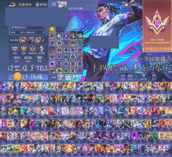 【Garena帳有綁定、星耀、V10、125英、1020造】「大神 1020造 累儲116w」次元 輝煌 永恆 新年 多聯動 多典藏 多稀世