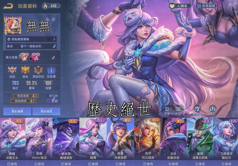 【Garena帳無綁無連、星耀、無VIP、32英、36造】歷史絕世 百星 蘇黎冰霜 女團 窺海 限定 無綁無連