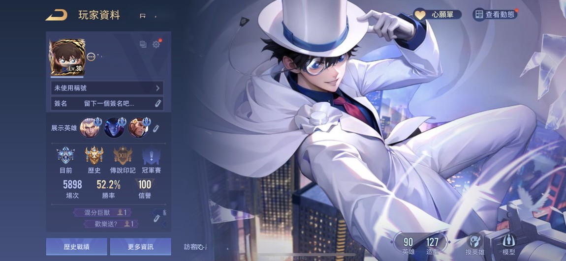 【Garena帳有綁定、先鋒傳說·新月、V1、90英、127造】歡迎詢問開價議價 柯南 基德 女團莉莉安 劫星 熹妃等
