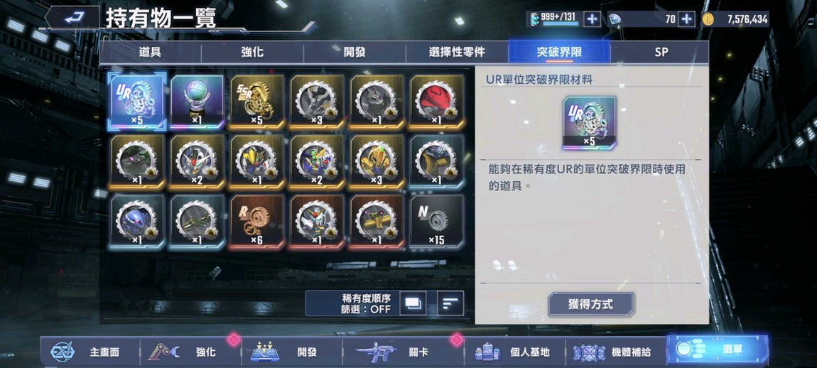 UR突破素材x5、戰艦突破素材x1、SR突破x5