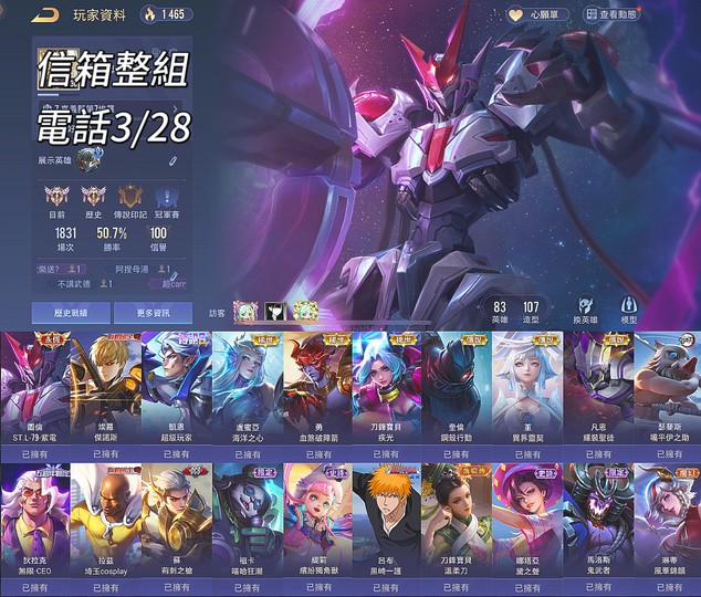 【Garena帳有綁定、戰場傳說、V7、83英、107造】稀有傑諾斯簡帳 圖倫紫電 刀鋒疾光多稀世多 限定造型伊之助 信箱整組電話3/28