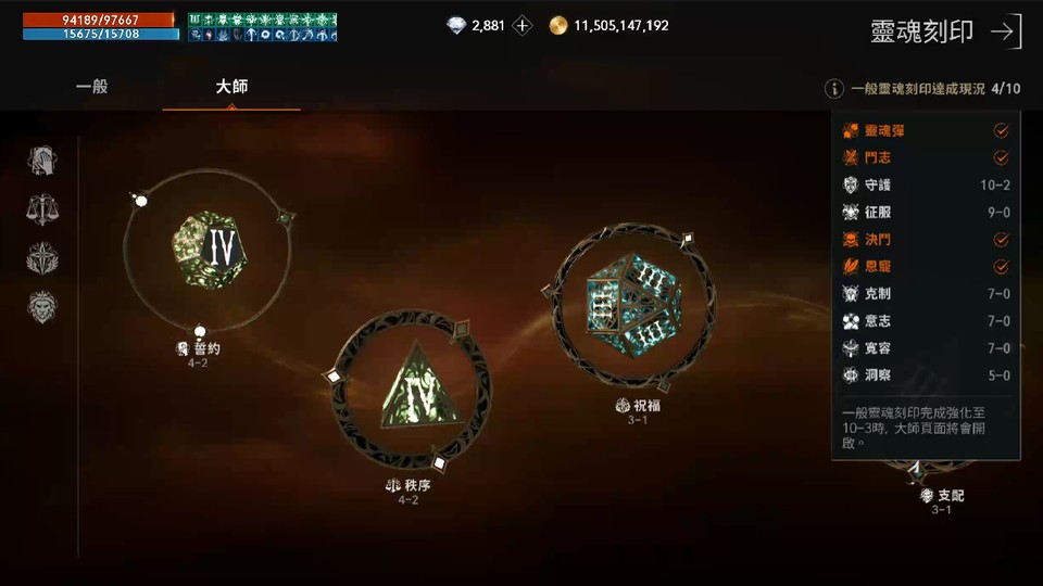 ★大師靈魂刻印:誓約4-2、秩序4-2、祝福3-1、支配3-1