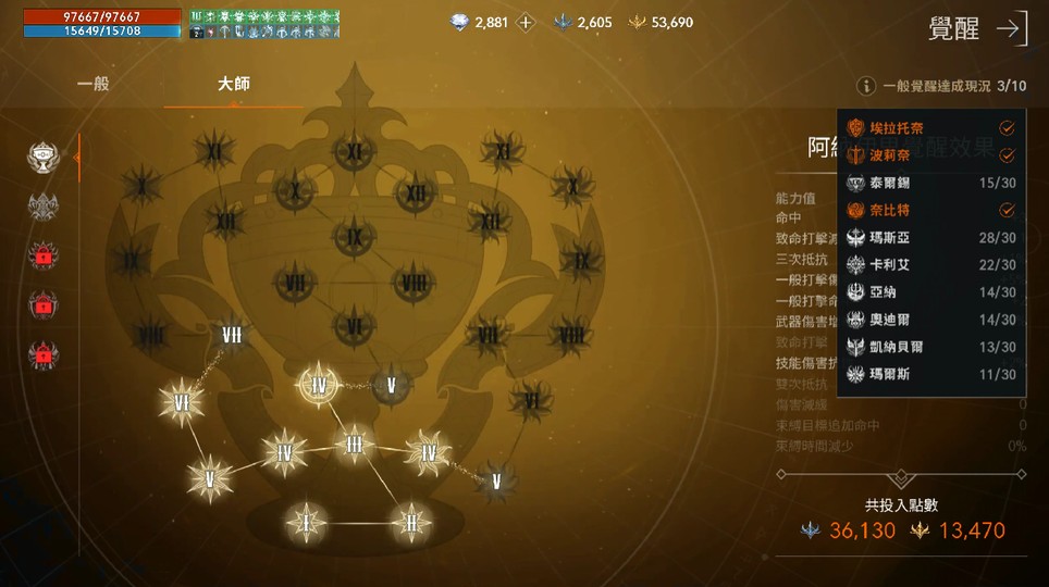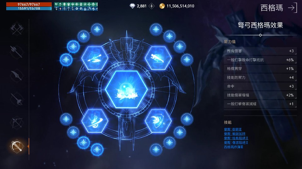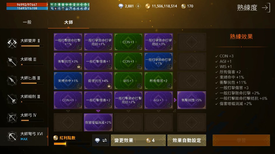紫共通技能:10紫 (攻擊增速加持、急速誦咒、推進III、精神勝利、絕對精準III、衝擊抵抗II、精準命中、實力記憶、帝國精通I、昇華防護)