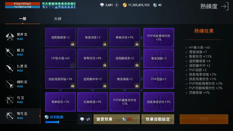 ★熟練度:一般弩弓紫盤,大師弩弓滿盤,其餘一般全MAX