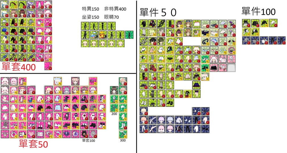 賣家出封印+25/個 衣櫥:武飾+110/髮上下+80/手鞋+40 連身衣櫥+150