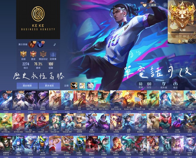 【Garena帳有綁定、絕世傳說、V8、60英、100造】歷史永恆+全服拉茲+爆球狂獅+單電+百星