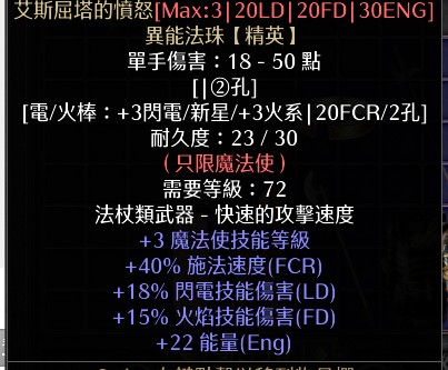 S13天梯[術士軍臨]艾斯屈塔的憤怒/+3魔法使技能/+40%施法/18電15火