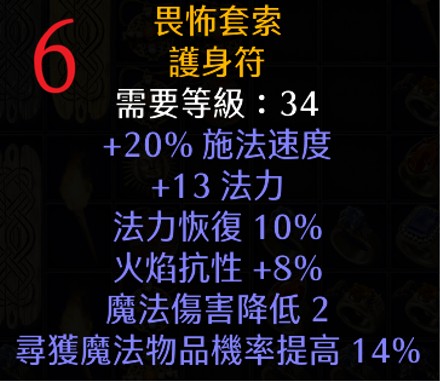 | 6 | 畏怖套索 | 34 | 20% FCR、+13 法力、10%法補、+8%火抗、14%打寶(MF) | 851 |
