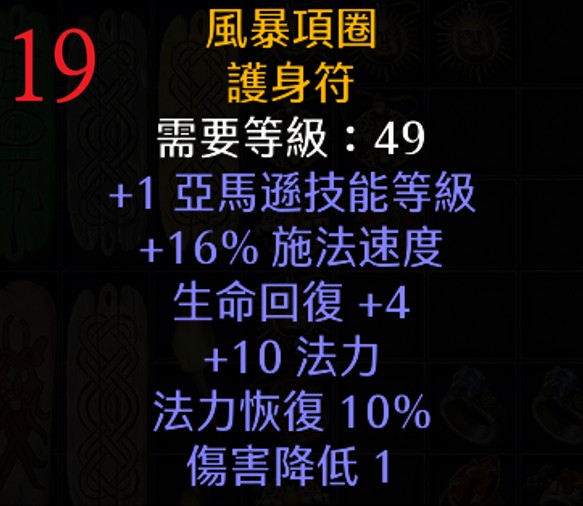 | 17 | 風暴項圈 | 49 | +1 亞馬、16% FCR、+10 法力、10%法補 | 319 |