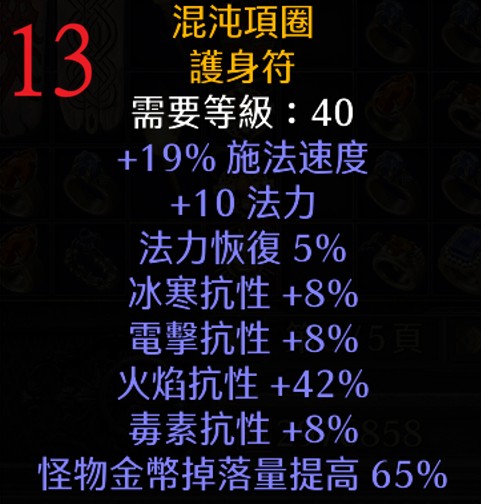 | 13 | 混沌項圈 | 40 | 19% FCR、+10 法力、5%法補、+42%火抗 | 426 |
