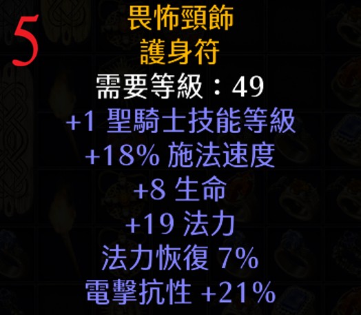 | 5 | 畏怖頸飾 | 49 | +1 聖騎士、18% FCR、+8 生命、+19 法力、+21%電抗 | 426 |