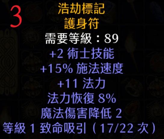 | 3 | 浩劫標記 | 89 | +2 術士、15% FCR、+11 法力、8%法補、魔傷低2 | 2128 |
