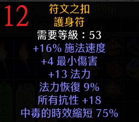 | 12 | 符文之扣 | 53 | 16% FCR、+4最小傷害、+13 法力、9%法補,+18全抗 | 319 |