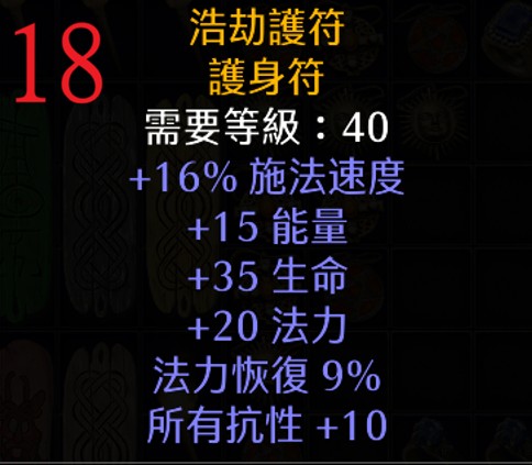 | 18 | 浩劫護符 | 40 | 16% FCR、+15能量,+35命 +20 法力、+10全抗 | 532 |