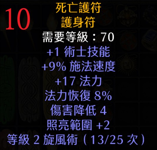 | 10 | 死亡護符 | 70 | +1 術士、9% FCR、+17 法力、傷低4、旋風術 | 319 |