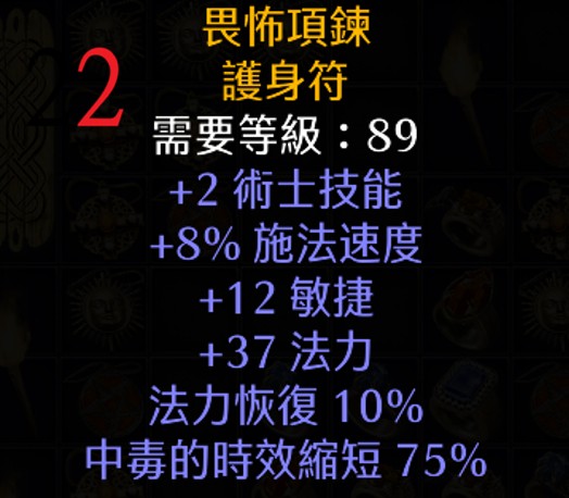 | 2 | 畏怖項鍊 | 89 | +2 術士、8% FCR、+12 敏捷、+37 法力、10%法補、毒縮75% | 532 |