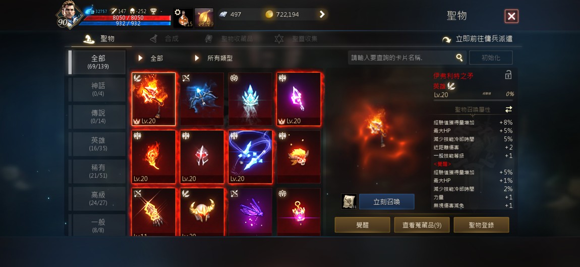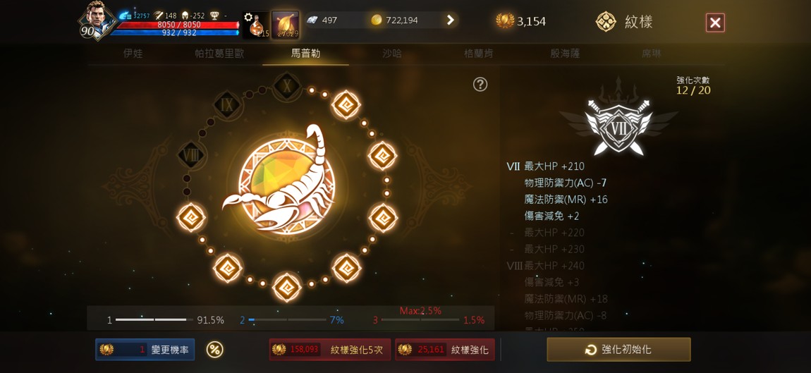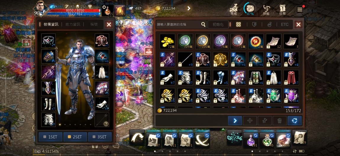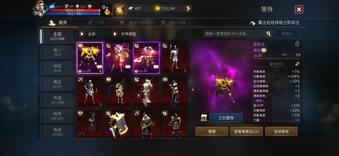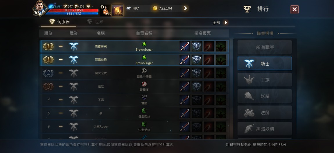 90級騎士,紫技5紅技8、攻擊147、物理防禦252,分身四隻防禦破200,紅武+7三支,紅防兩件