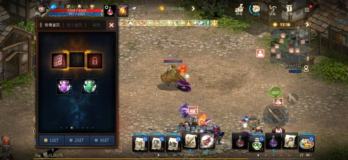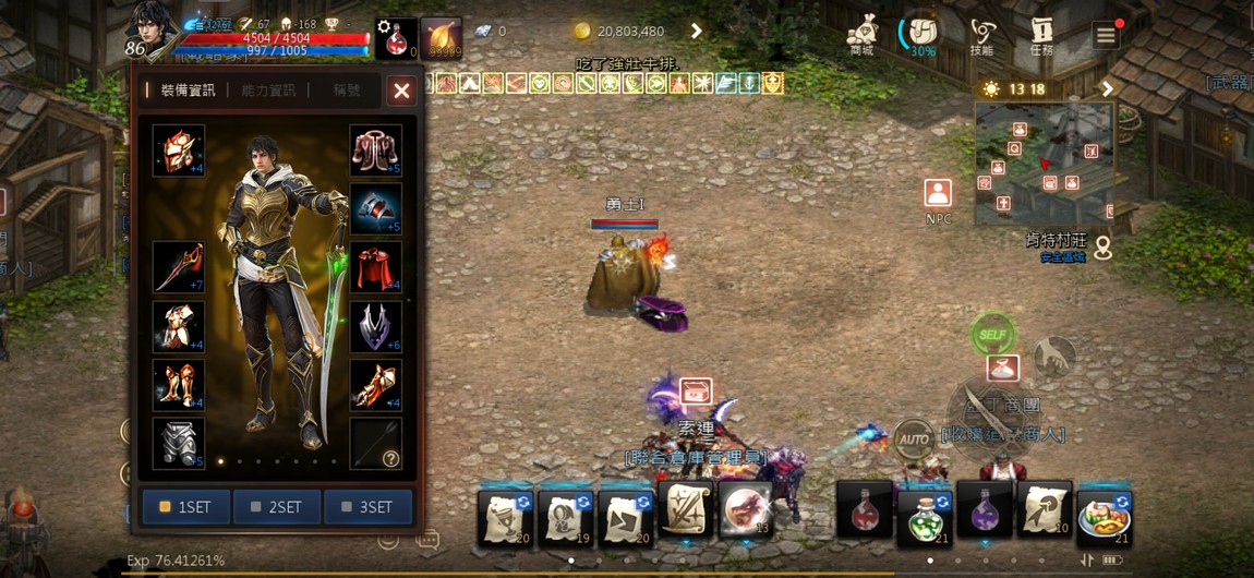 +7騎士團符石劍(紅武)、+4祝福騎士團頭盔、+4祝福騎士團盔甲、+4祝福騎士團長靴、+4祝福騎士團手套、+4騎士團披風(紅裝)、+6武官之盾、+5鐵門褲子、+5光之力量肩甲、+5光之力量內衣