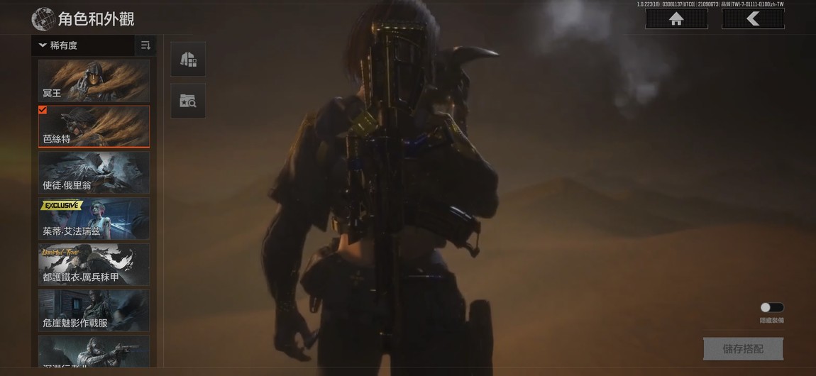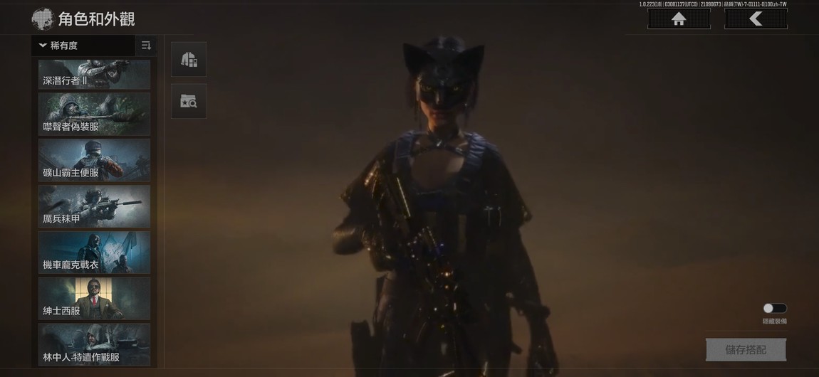 冥王、巴斯特(貓女)、都護鐵衣(黑 風雪玉門)、使徒(烏鴉哥)、茱蒂(2077 女)、危崖魅影、深潛行者、噤聲者、礦山霸主、厲兵秣甲、機車龐克、紳士西服(西裝)、林中人...等13款金皮衣服 及多款紫品質色衣服👕