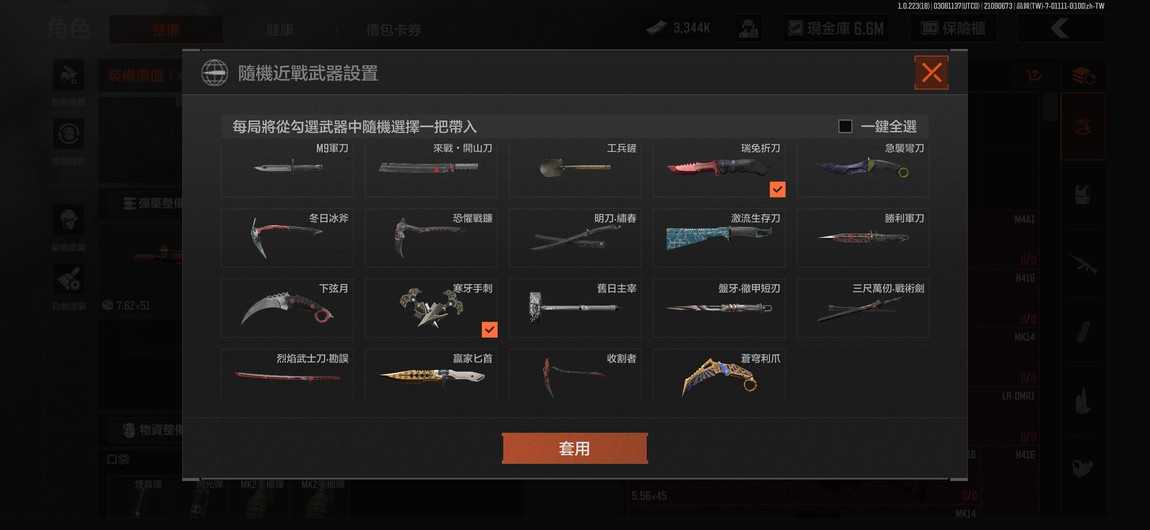 瑞兔折刀、急襲彎刀、明刀繡春、冬日冰斧、激流生存刀、寒牙手刺、下弦月、贏家匕首、恐懼戰鐮、蒼穹利爪、舊日主宰、盤牙短刃、三尺萬仞(刻名字)、收割者、烈焰武士刀... 16把刀皮🗡️