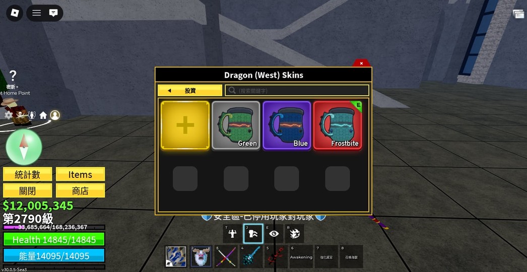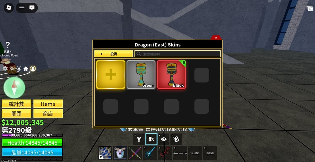 皮膚:黑東龍、淺綠西龍 紅鑽石、綠雷 黃雷