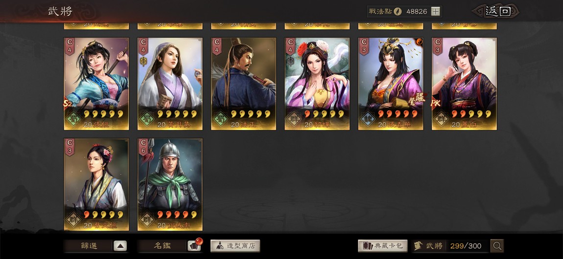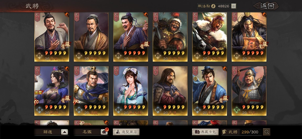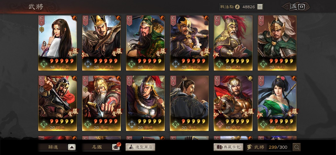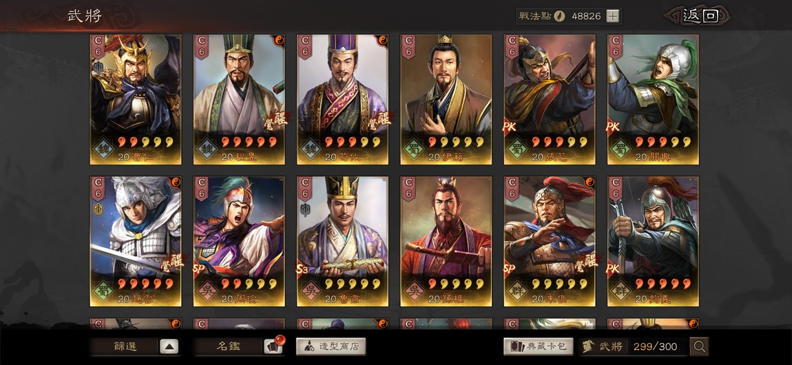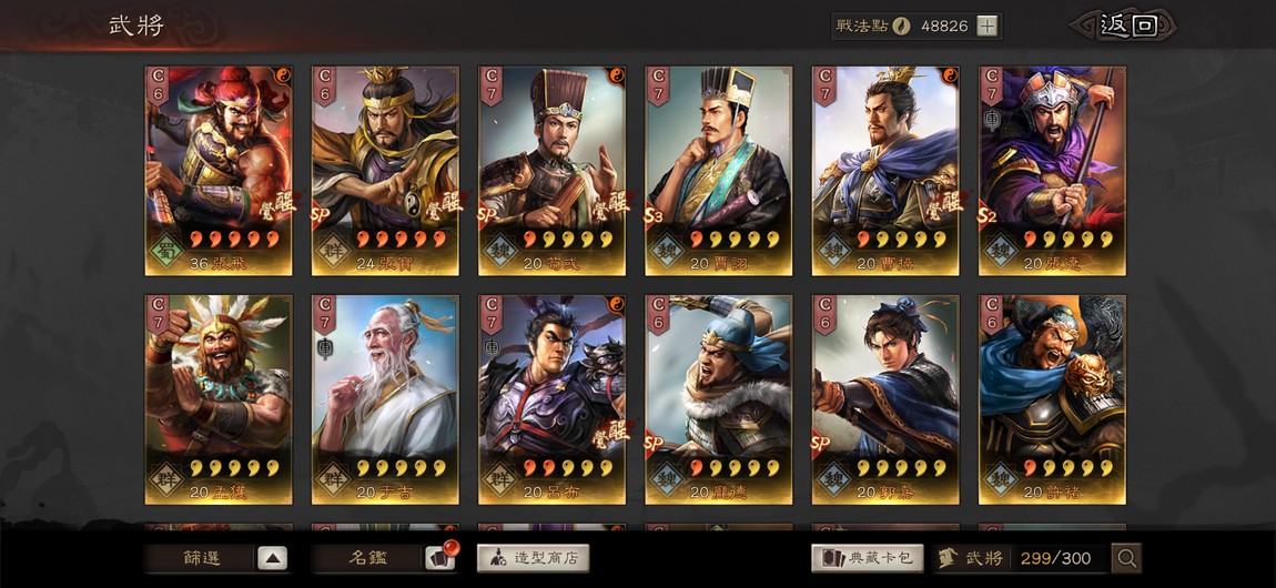 重點特技統整:剛體1 暴躁1 踩踏2 好學4 靈動5 華服1 號令1 武聖1 雄烈1 無雙1 弓神1 昭烈1 天公1 長慮1 考工殘券10