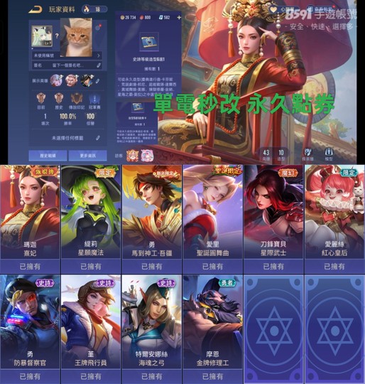 【Garena帳有綁定、青銅、V1、43英、10造】單電秒改 熹妃全套 永久點券