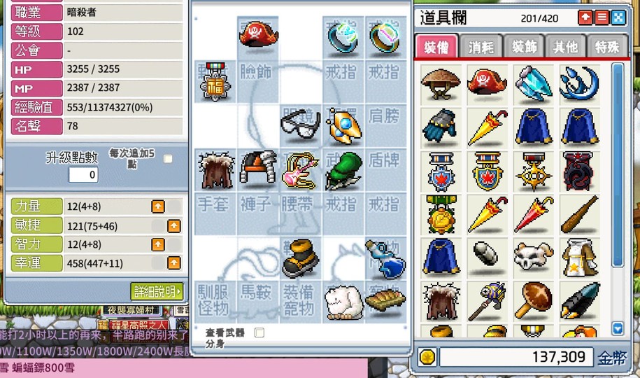 【102等、暗殺者_夜使者】退坑 幸運機 420格包 寵物+寵技123+造型 0洗血 有眼鏡 可雙改